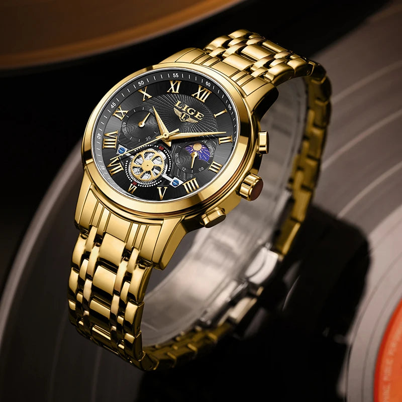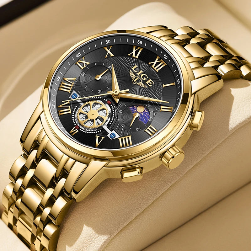 The Altair Watch combines sleek stainless steel construction with practical features like a 3-bar water resistance rating and a reliable quartz movement. Its 41mm round case features a Hardlex crystal dial window with luminous hands and Arabic numeral markers for easy reading. Designed for both fashion and casual wear, this watch includes a chronograph, stopwatch, moon phase display, and shock resistance. The push-button hidden clasp ensures a comfortable, secure fit on its 25cm stainless steel band. A perfect companion for daily use that blends style and functionality.