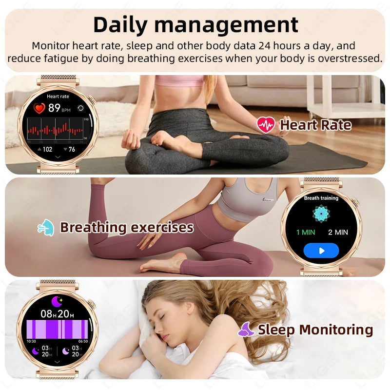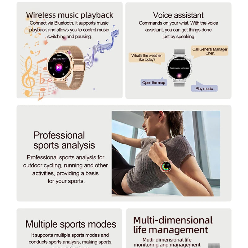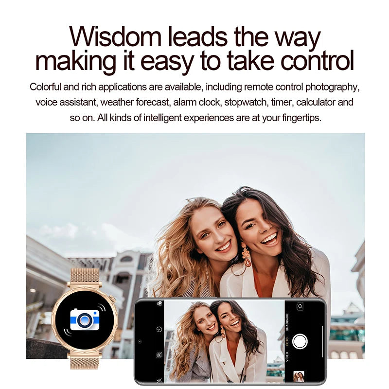 The Teck Nova Watch is a sophisticated smart watch tailored for female users seeking comprehensive health and activity monitoring. It features a 1.6-inch digital glass display housed in a durable alloy case, paired with a comfortable silica gel band. The watch tracks steps, distance, calories, and overall activity, integrating seamlessly with the FitCloudPro app. Bluetooth 5.2 ensures reliable connectivity across all compatible